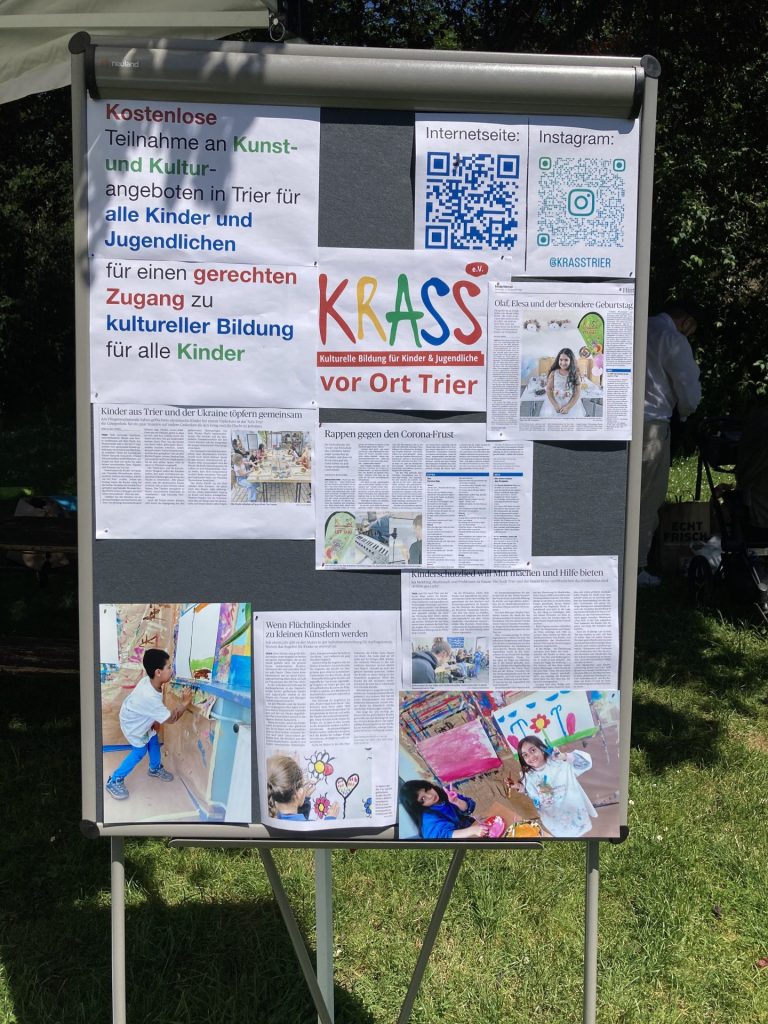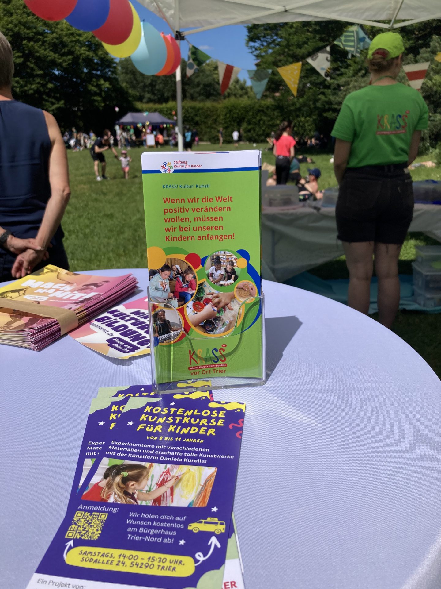 Wir hatten eine wundervolle Zeit beim Trierer Kindertag. ? Zusammen mit vielen fröhlichen Kindern haben wir uns hübschen Blumenschmuck gebastelt, viel gelacht, glitzernde Seifenblasen in den Himmel geschickt und in der strahlenden Sonne die Möglichkeit genutzt, anderen Menschen unsere KRASS-Philosophie näher zu bringen. ☀️ Vielen Dank an unsere lieben Ehrenamtlichen Gi, Anneke, Johanna und Viktoria. Ohne euch wären Aktionen wie diese nicht möglich! Danke an Claudia Pomowski für den tollen Kunstkurs. ?Wir bedanken uns außerdem bei der Mobilen Spieleaktion, die uns tatkräftig unterstützt und super betreut hat. ?