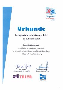 Hier kommen Kreativität, Konzeptstärke, Organisationstalent, Kommunikationskompetenz, Verantwortungsbewusstsein und Verbindlichkeit in einer Weise bei einem jungen Menschen zusammen, wie es preiswürdiger nicht sein könnte. Frau Wonnebauer leistet damit wichtige Dienste für das Trierer Gemeinwesen und die lokale Bildungsarbeit.“