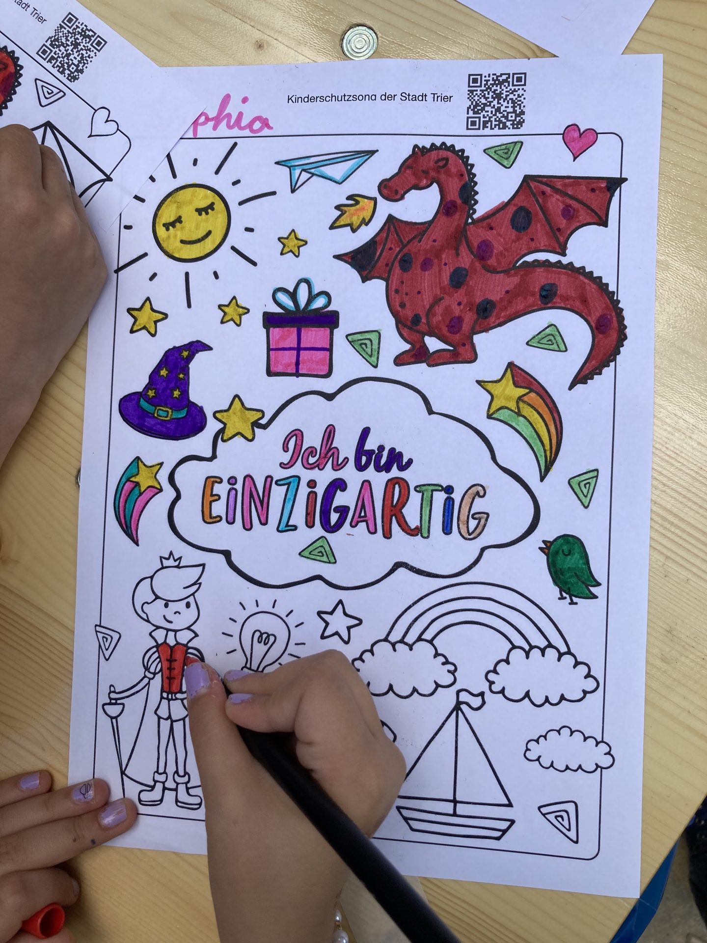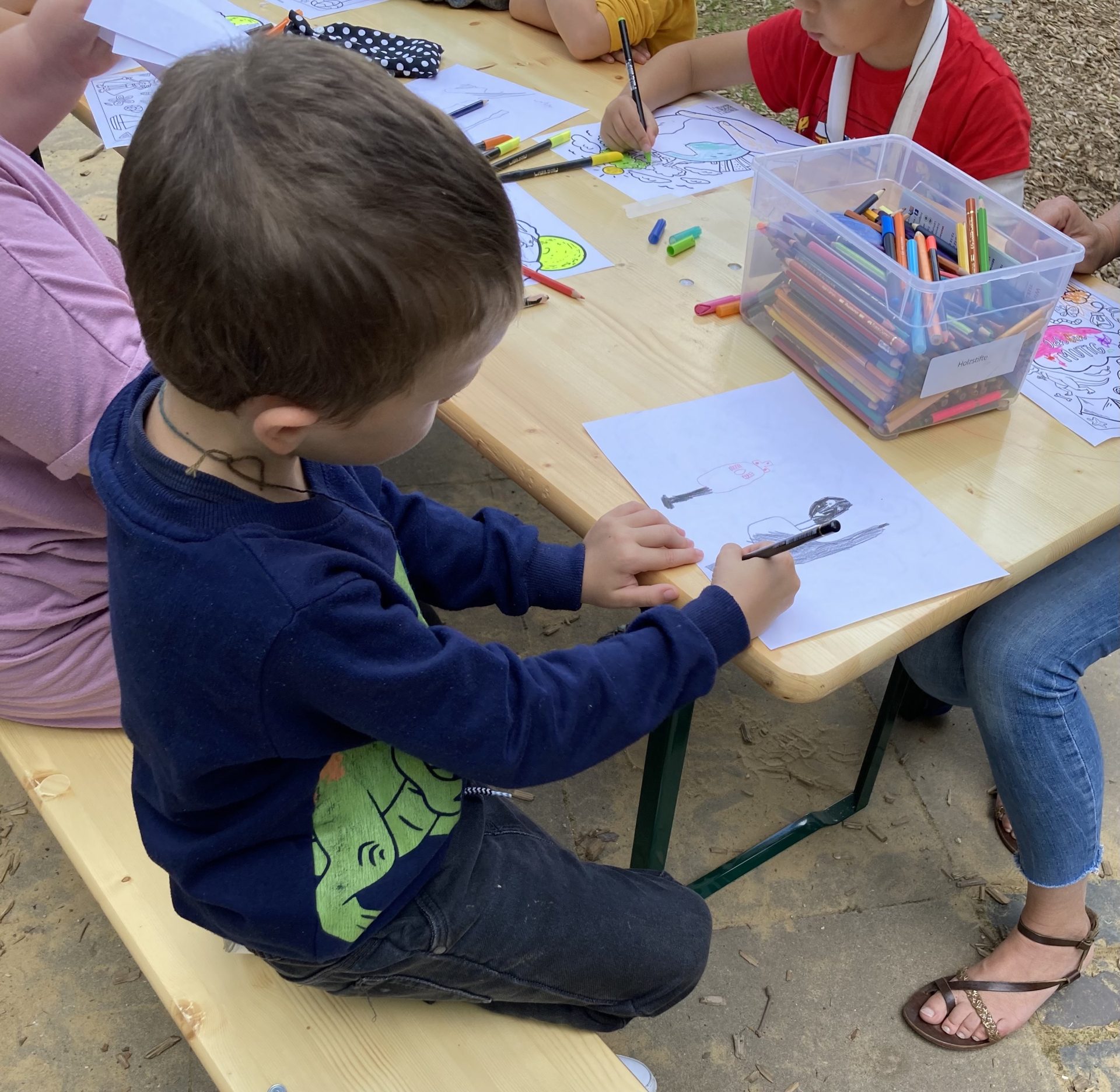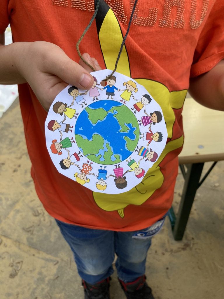 Circa 35 Kinder haben mit uns Ketten gebastelt, Ausmalbilder mit Power-Sprüchen wie „Ich bin mutig“ oder „Ich bin einzigartig“ ausgemalt, frei gezeichnet und gemeinsam einen Stoffbanner mit Acrylfarben bemalt. Lea vom Tanzstudio Patricia Meier hat mit den Kindern zum Schluss die Choreografie zum Kinderrechtelied 2023 „Ich darf das“ getanzt.