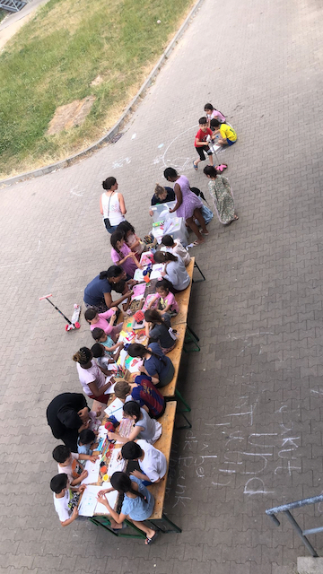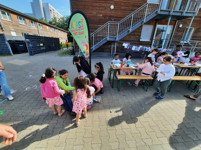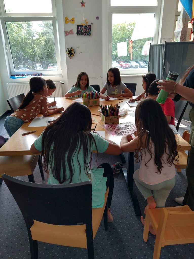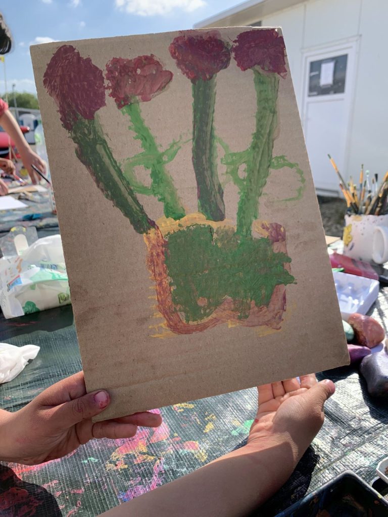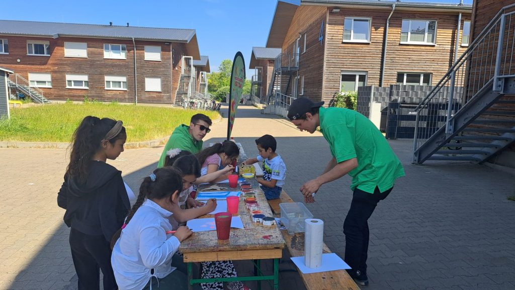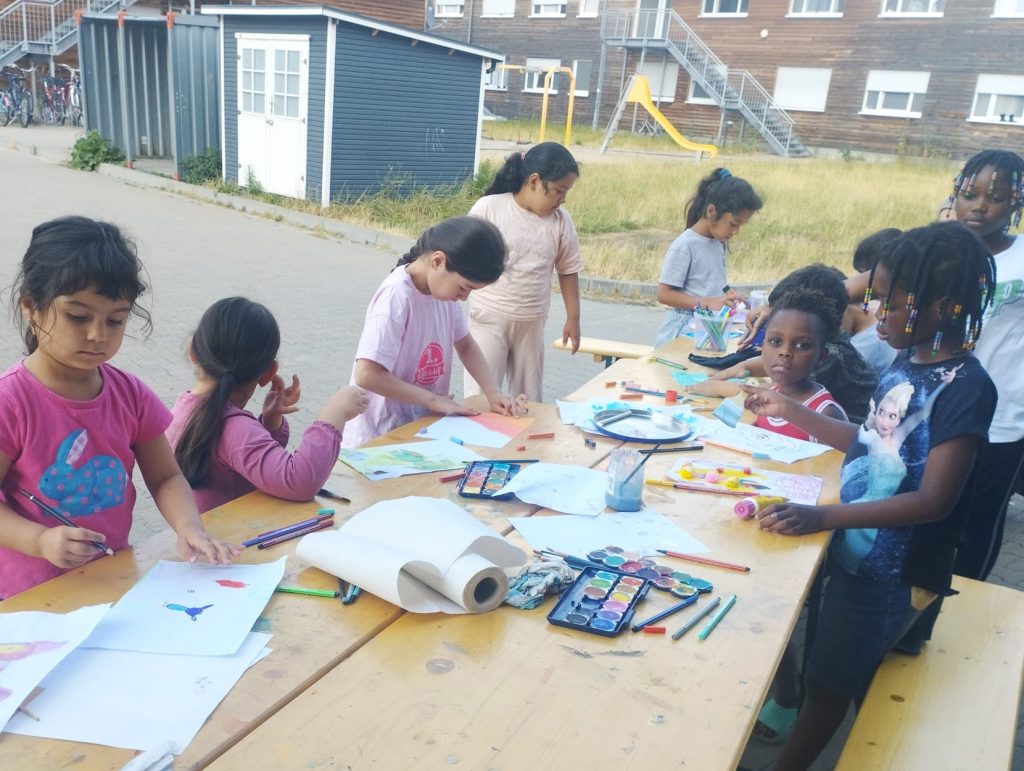 Das Team brachte Farben, Papier, Bastelmaterialien und viele kreative Ideen mit. In den Unterkünften entstand so regelmäßig ein geschützter Raum, in dem die Kinder malen, basteln, gestalten und sich ausdrücken konnten. Durch dieses kreative Angebot erhielten sie nicht nur eine wertvolle Auszeit vom oft schwierigen Alltag, sondern auch die Möglichkeit, spielerisch Deutsch zu lernen. Der niedrigschwellige Sprachunterricht erfolgte dabei ganz praktisch – beim Malen, Basteln und gemeinsamen Erzählen.