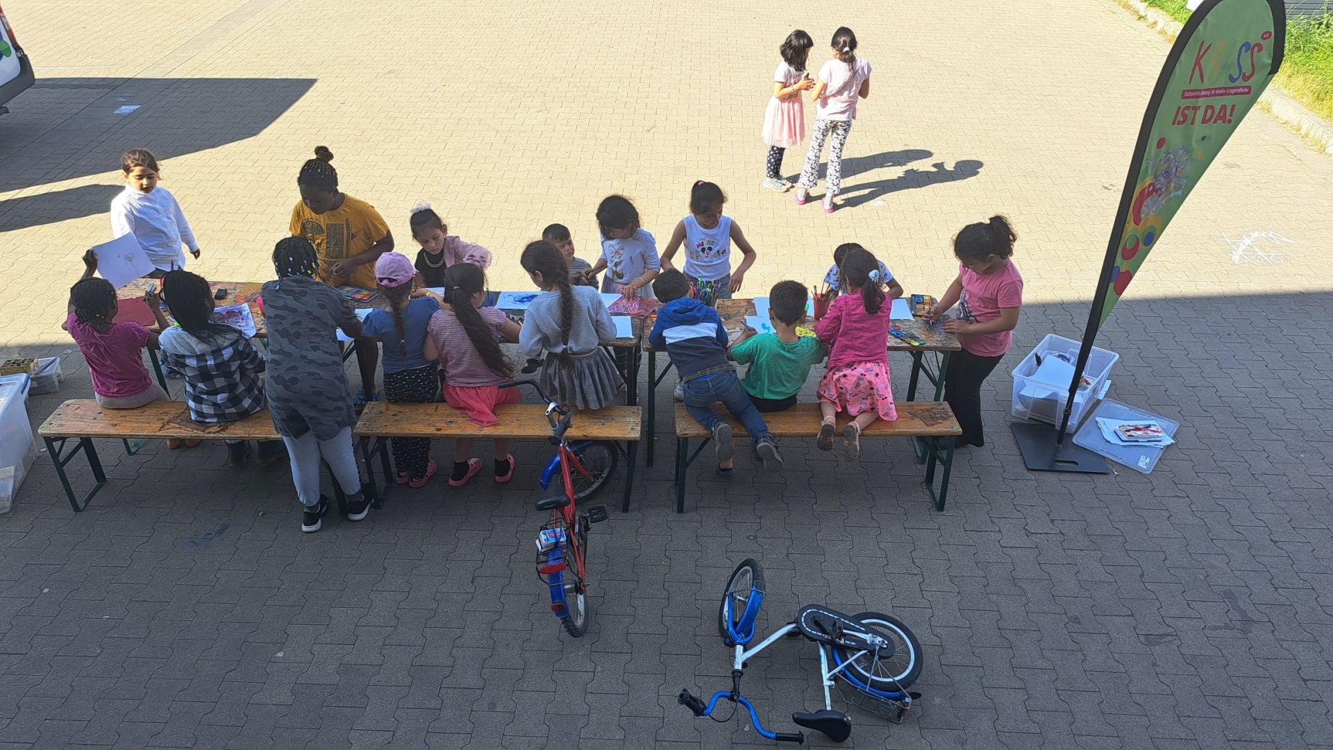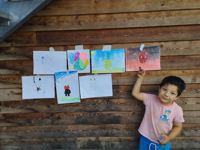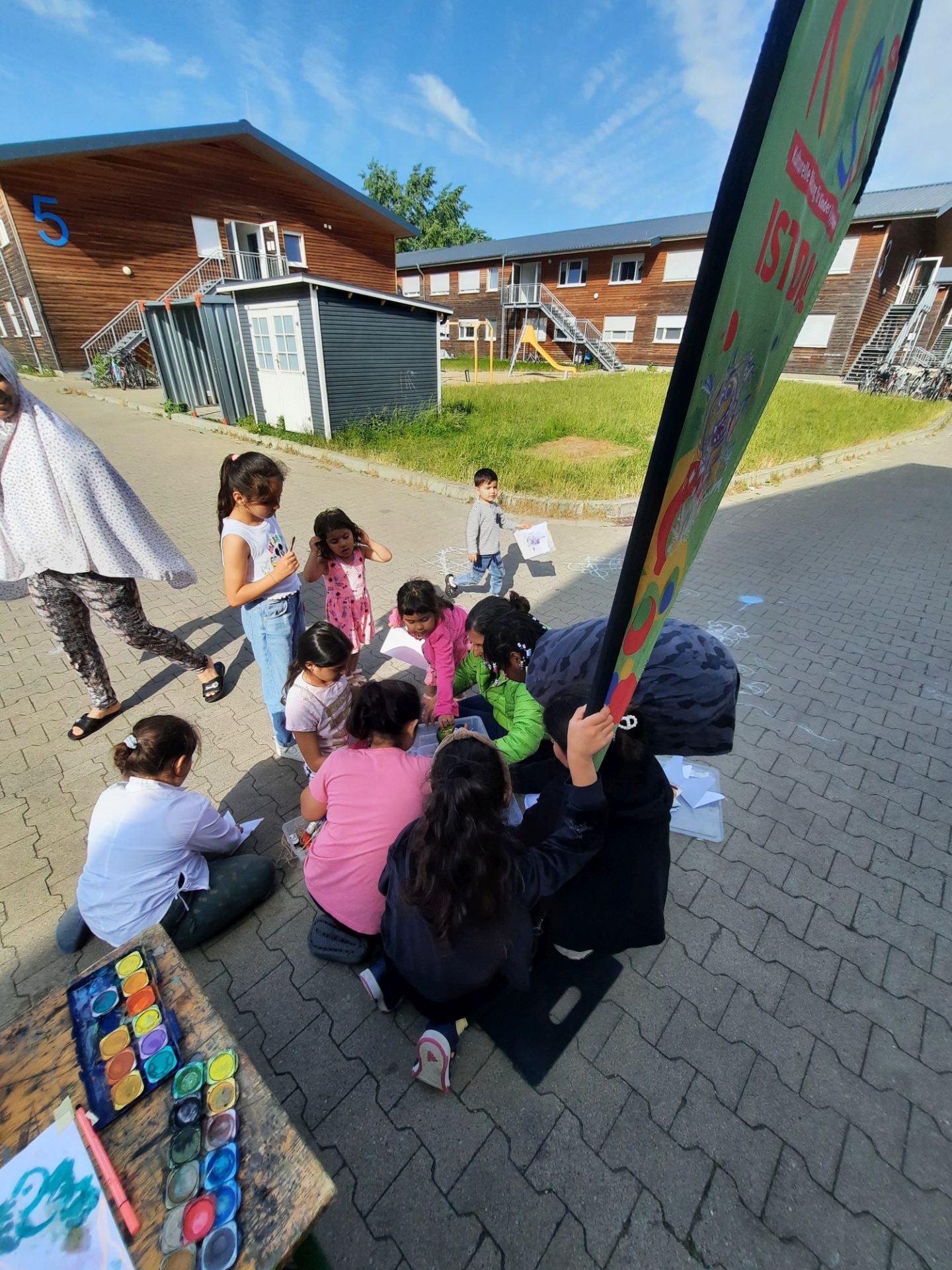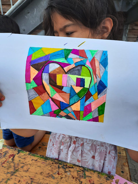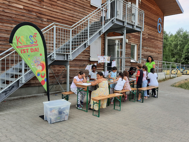 Das Team brachte Farben, Papier, Bastelmaterialien und viele kreative Ideen mit. In den Unterkünften entstand so regelmäßig ein geschützter Raum, in dem die Kinder malen, basteln, gestalten und sich ausdrücken konnten. Durch dieses kreative Angebot erhielten sie nicht nur eine wertvolle Auszeit vom oft schwierigen Alltag, sondern auch die Möglichkeit, spielerisch Deutsch zu lernen. Der niedrigschwellige Sprachunterricht erfolgte dabei ganz praktisch – beim Malen, Basteln und gemeinsamen Erzählen.